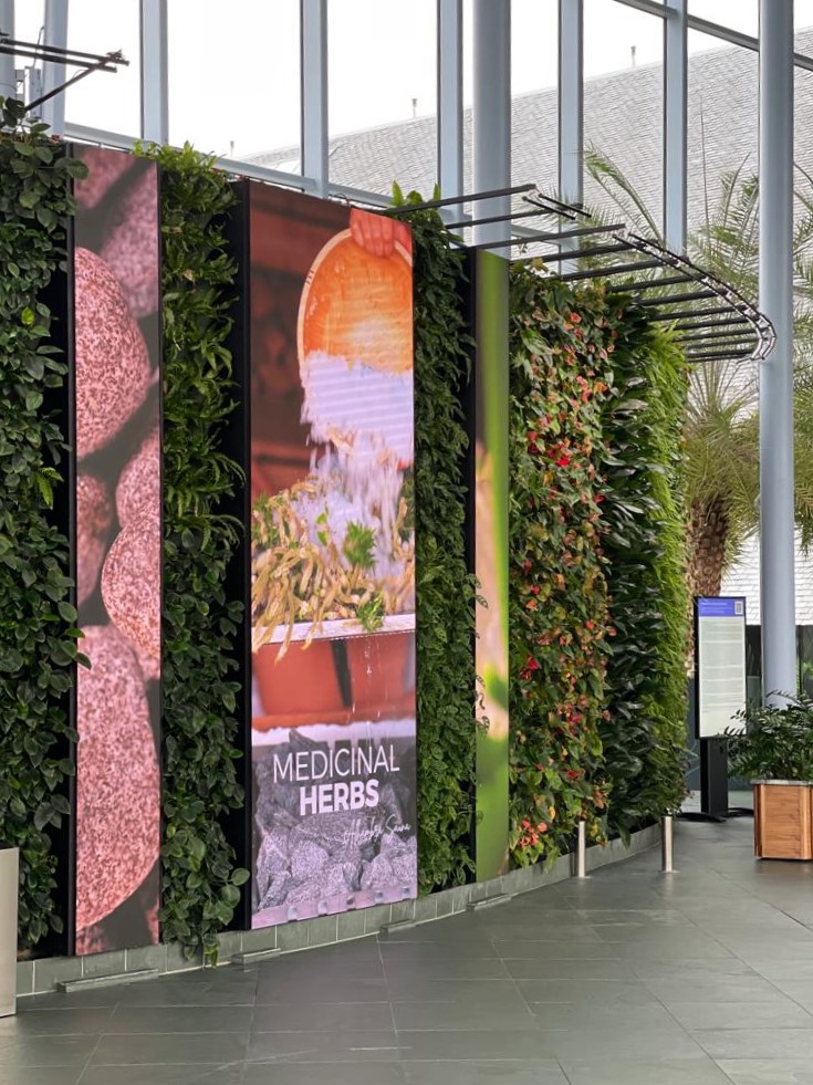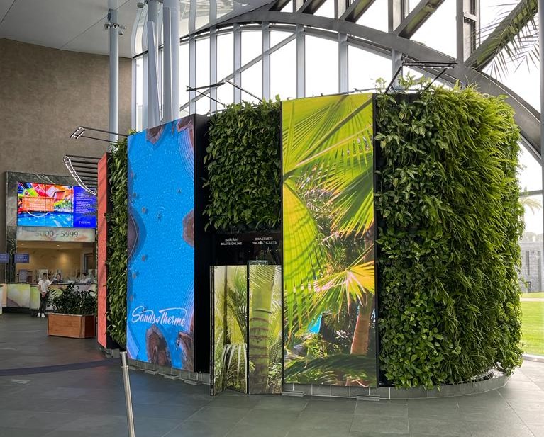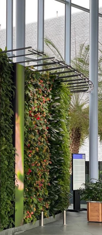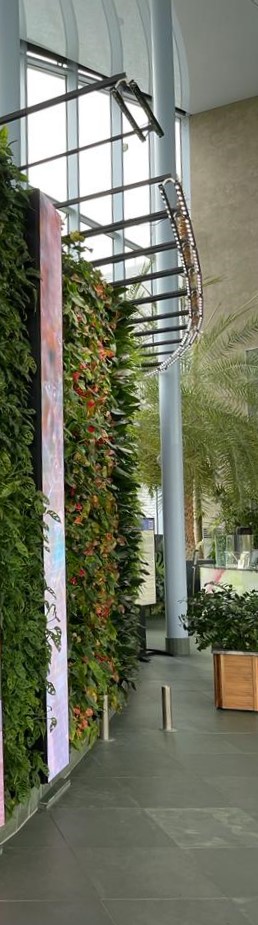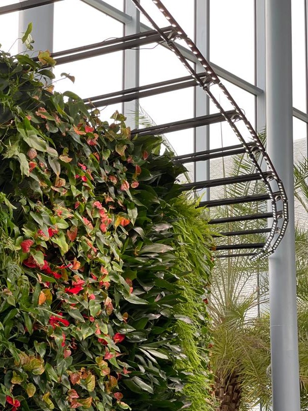 De afstand tussen deze enorme groene muren en het plafond is erg groot. Daarom hebben we ervoor gekozen om de lineaire lampen via strips aan de muur zelf te bevestigen. Zo vinden we altijd een creatieve oplossing voor elk project!